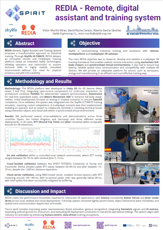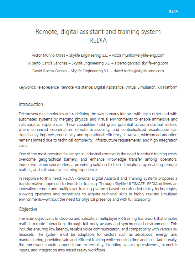 Skylife REDIA project (Remote, digital assistant and training system) is revolutionising industrial training with Skylife ULTIMATE, an innovative, remote and multiplayer solution that allows operators and technicians to train in collaborative extended reality from any location. We are evolving from telepresence to an immersive and dynamic experience where multiple users can communicate and interact in the same simulated environment, improving learning and coordination in critical environments.