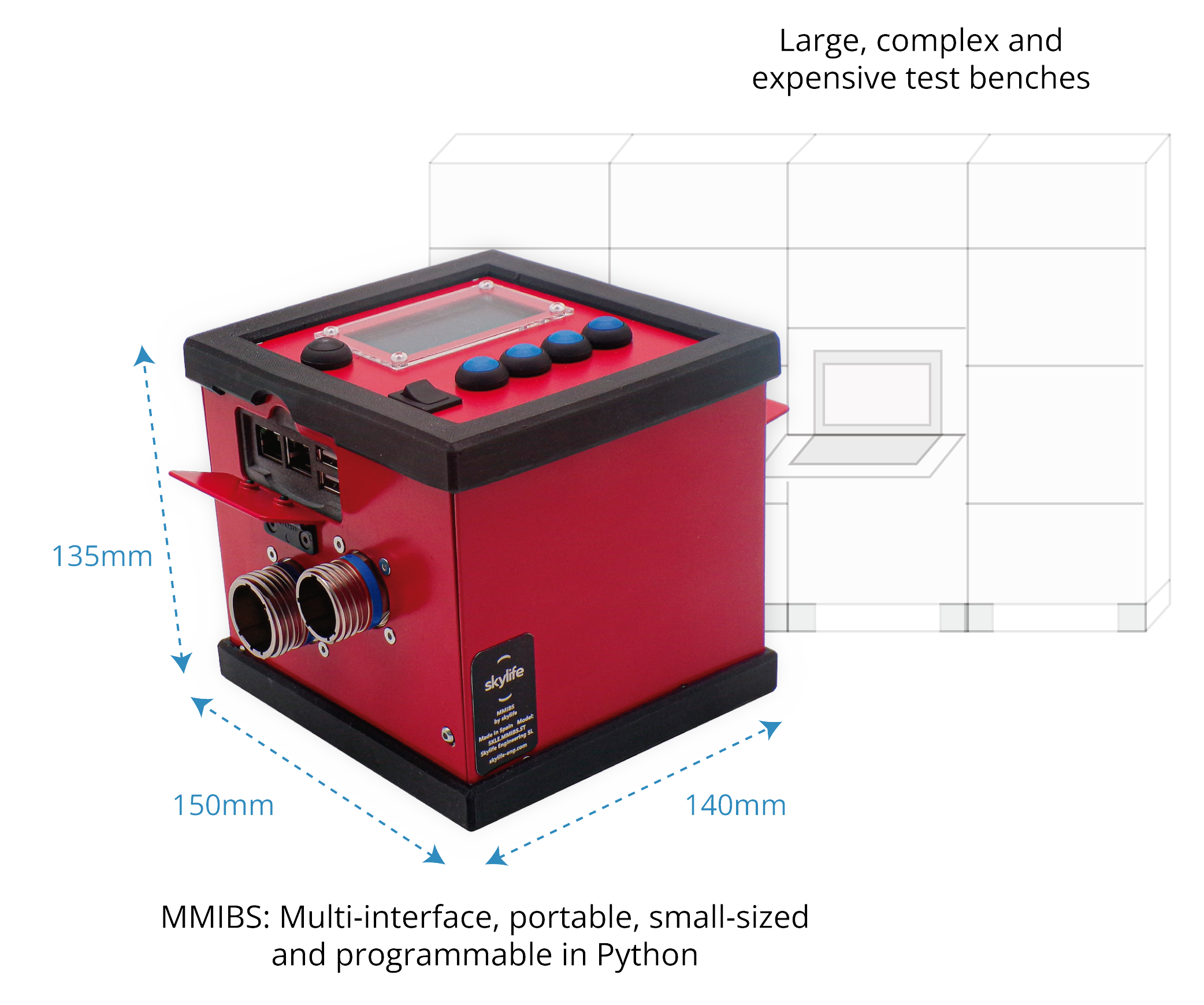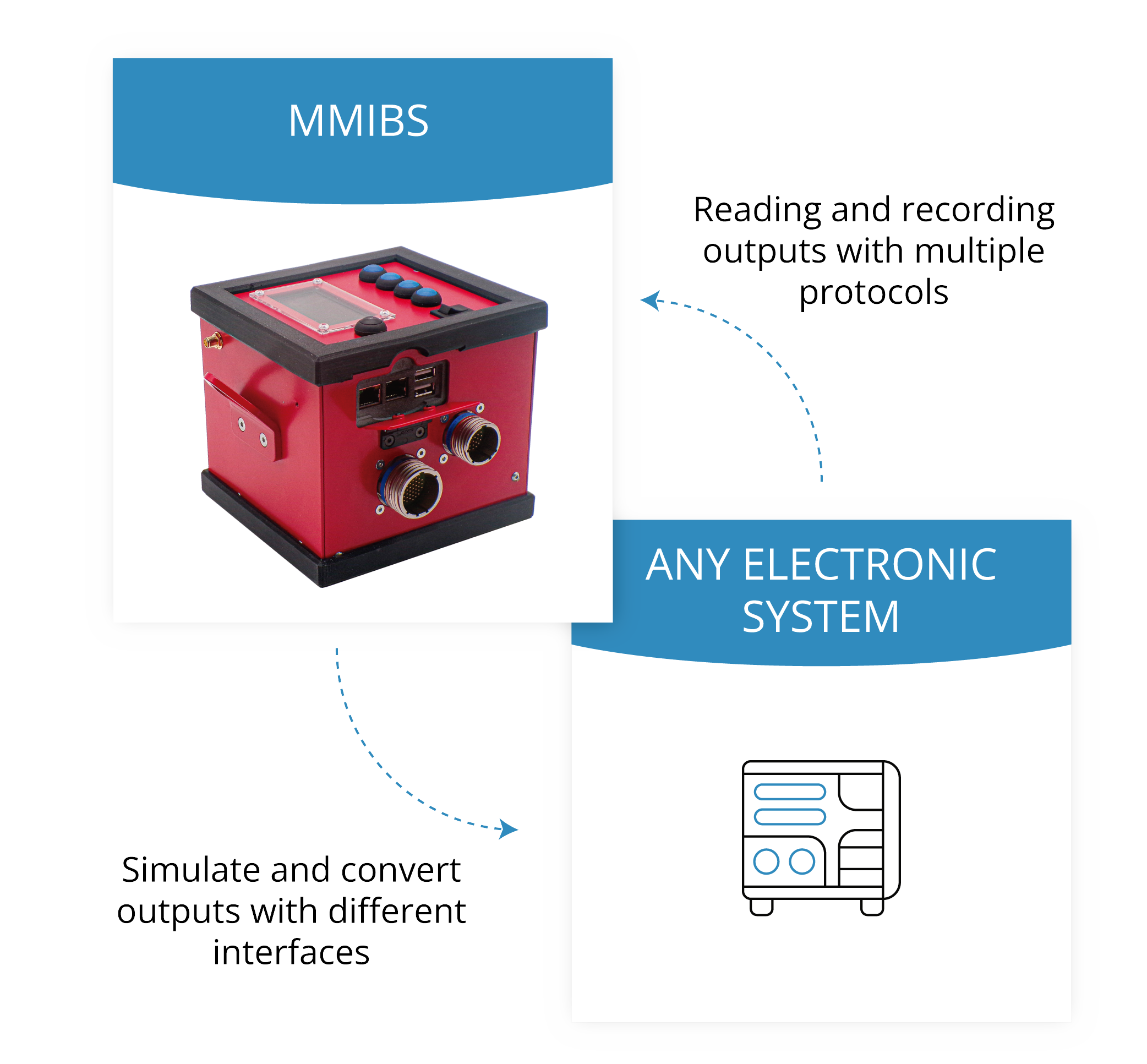 Dispositivo multi-interface, programable en Python, portátil y de reducidas dimensiones para facilitar la realización de pruebas y simulaciones de aviónica y electrónica. Permite emular o leer los principales protocolos de sistemas embarcados aeronáuticos: ARINC-429, MIL-1553, AFDX o CAN.